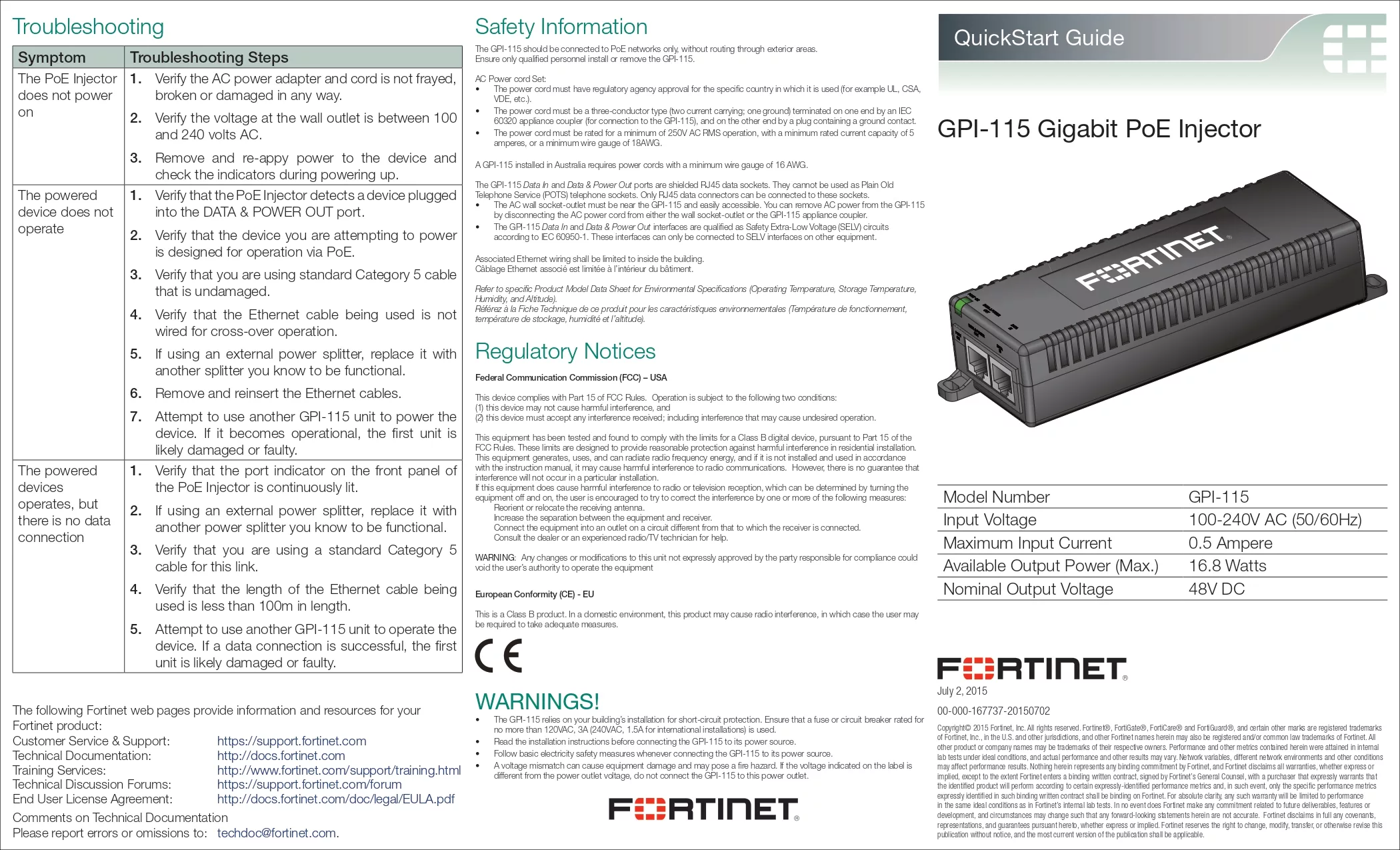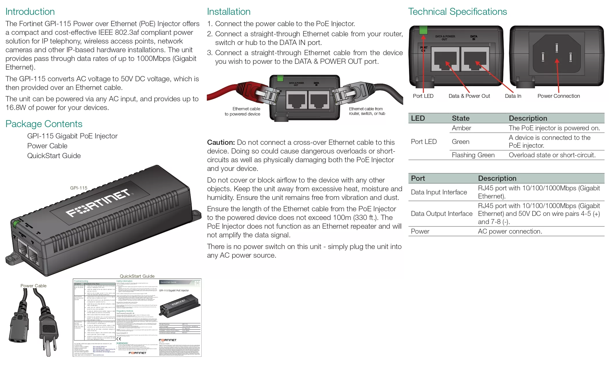 Se trata de un inyector Gigabit Power over Ethernet de 1 puerto 802.3af 15,4 W para los puntos de acceso Fortinet.